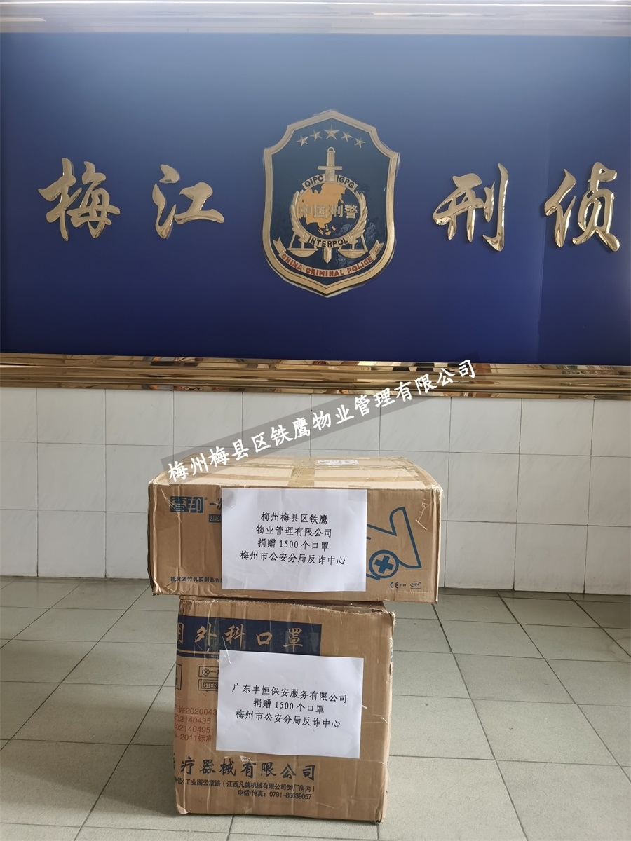 2021年8月6日,梅州梅县区铁鹰物业管理有限公司与广东丰恒保安服务有限公司梅州分公司,分别向梅州市公安分局反诈中心捐赠1500个口罩。